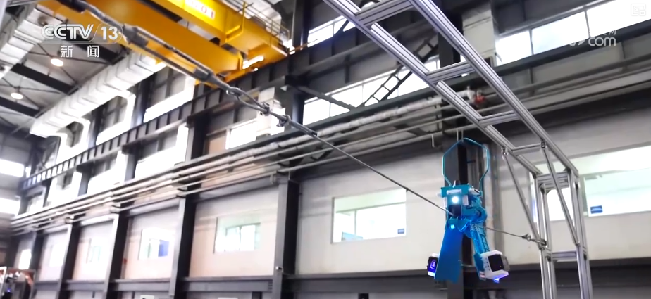 在模仿的超高压输电线路上方,一场特别的“高空芭蕾”正在进行。一台地线除冰机器人正在演示覆冰导线上作业,发动除冰程序。