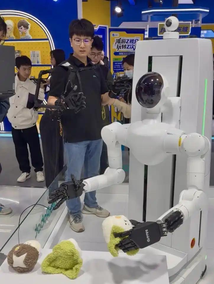 “取完他的取她的,取完她的取你的!”灵巧智能展区的工作人员正操作着DexHand021 Pro机器手“隔空取物”,与现场观众互动。